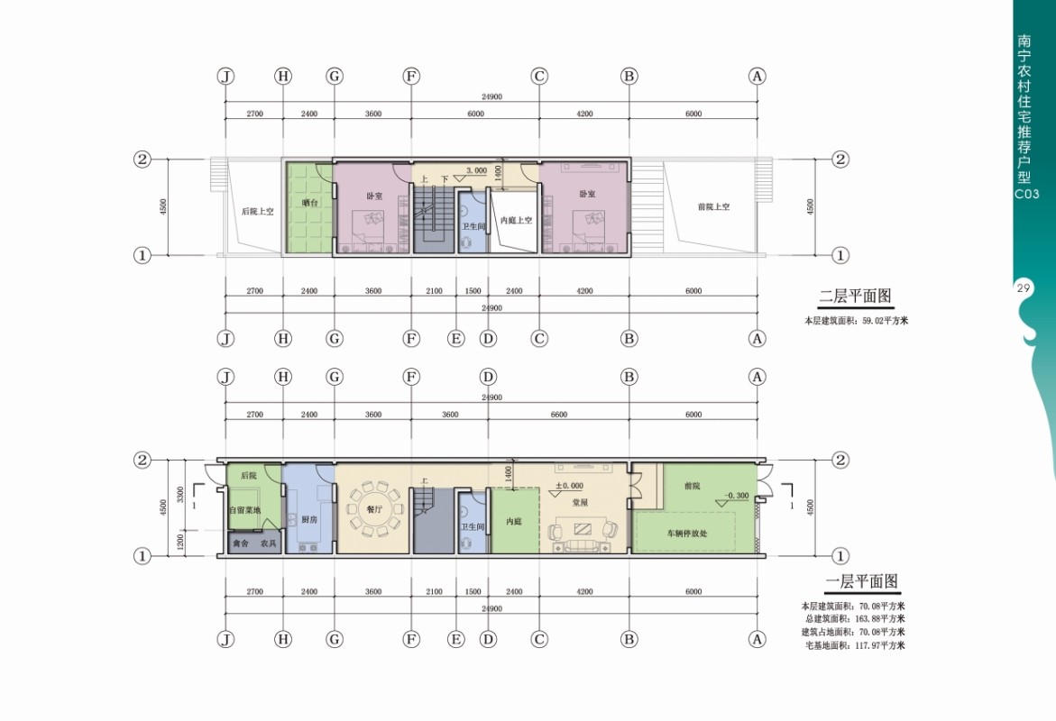 本户型占地面积70.08平方米,建筑面积163.88平方米。户型设计上秉承了“生态、人居、文化”的设计概念,充分挖掘传统民居建筑风格和地域文化特色。布局上平面紧凑,顶层有大储物间,以利于晒台功效的发挥。
